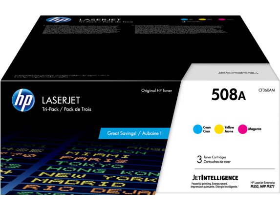 HP 508A 3-pack Cyan/Magenta/Yellow Original LaserJet Toner Cartridges, CF360AM